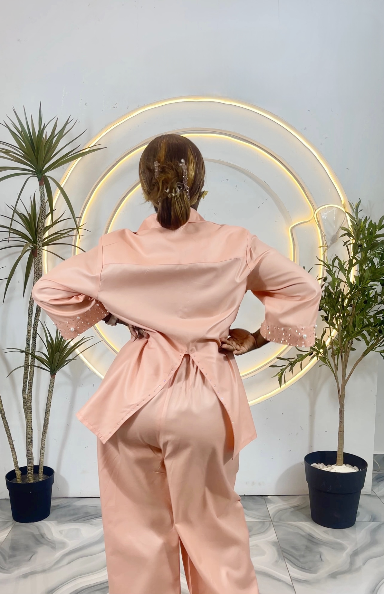The shirt stands out with its slit detail at the back, adding a subtle touch of sophistication. The cuff, collar and the edges of the back slit are meticulously adorned with handmade pearl and rhinestone applications, creating a luxurious shimmer that elevates the entire ensemble.